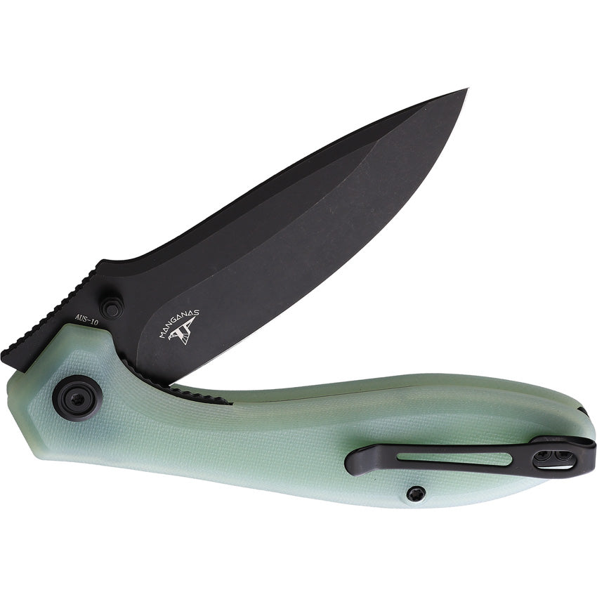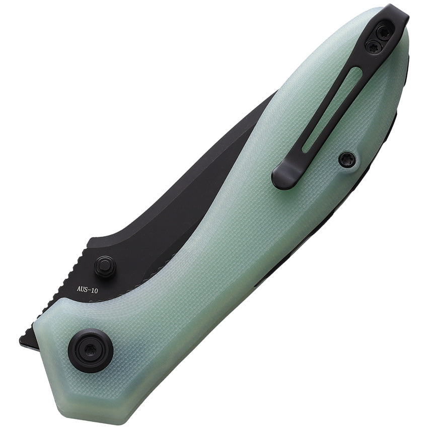 4.75" (12.07cm) closed. 3.5" (8.89cm) black stonewash finish AUS-10A stainless blade. Jade G10 handle. Thumb stud. Extended tang. Pocket clip. Boxed.