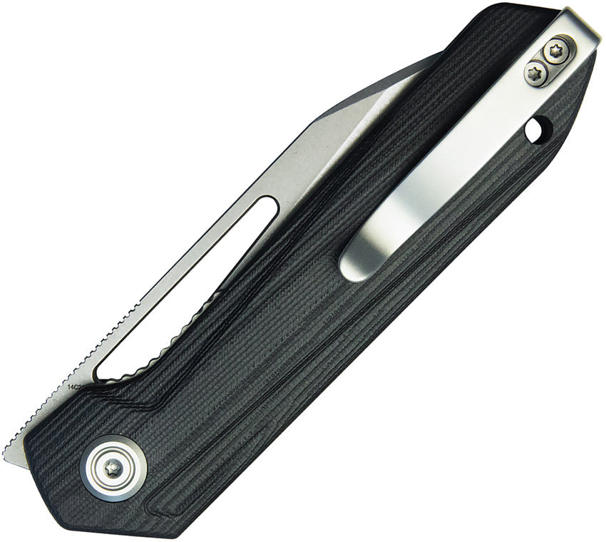 4.25" (10.8cm) closed. 3" (7.62cm) stonewash finish 14C28N Sandvik stainless blade. Black G10 handle. Extended tang. Thumb pull. Lanyard hole. Pocket clip. Boxed.