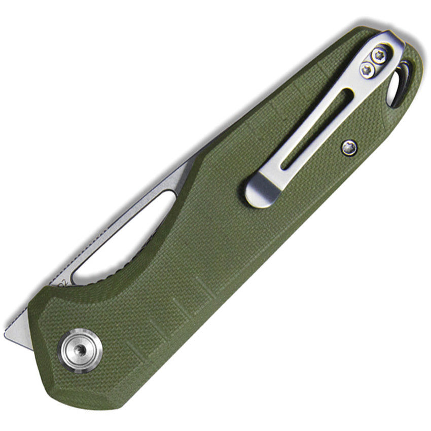 4.5" (11.43cm) closed. 3.25" (8.26cm) stonewash finish D2 tool steel blade. OD green G10 handle. Extended tang. Lanyard hole. Pocket clip. Thumb pull. Boxed.