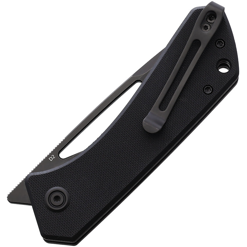 4.5" (11.43cm) closed. 3.25" (8.26cm) black finish D2 tool steel blade. Black G10 handle. Thumb pull. Lanyard hole. Pocket clip. Boxed.