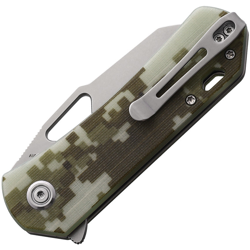 4" (10.16cm) closed. 3" (7.62cm) satin finish D2 tool steel blade. Digital camo G10 handle. Extended tang. Thumb pull. Lanyard hole. Pocket clip. Boxed.