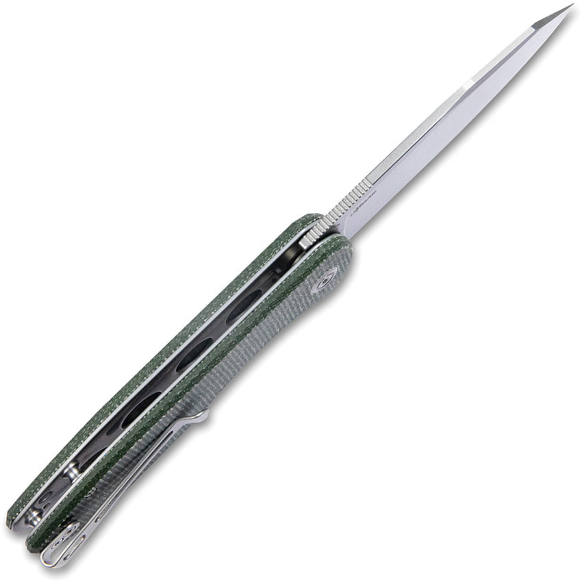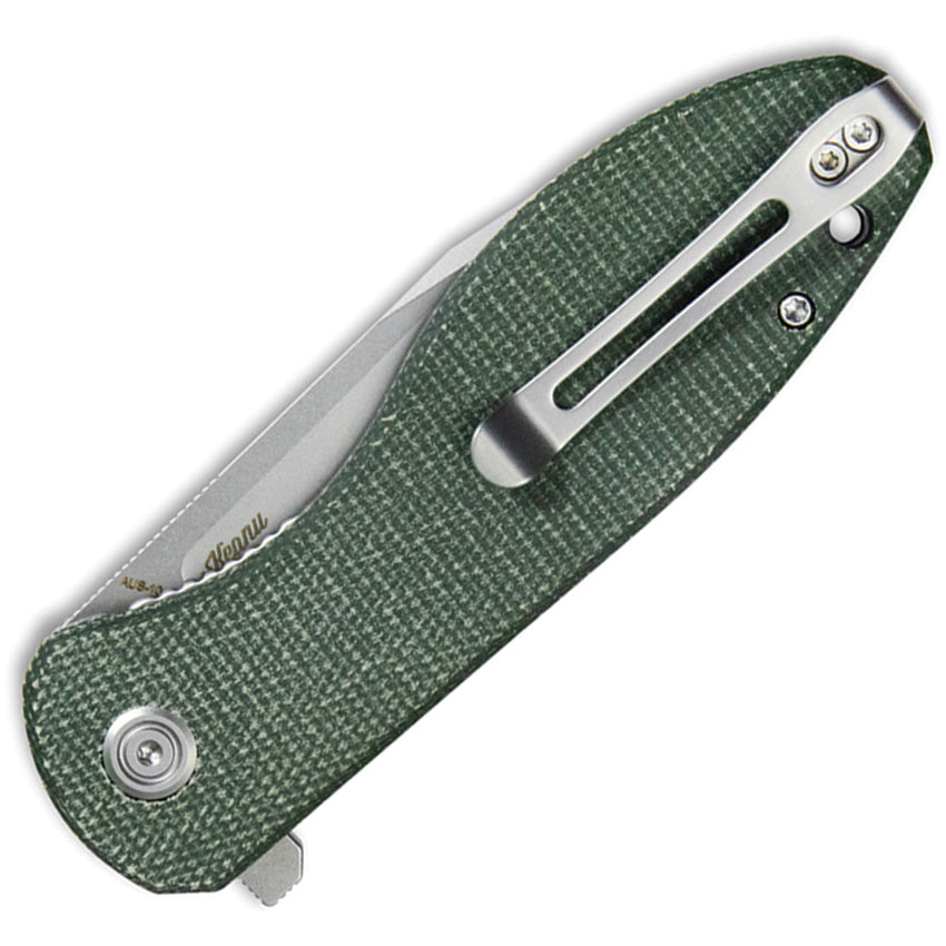 4.63" (11.76cm) closed. 3.63" (9.22cm) stonewash finish AUS-10A stainless blade. Green canvas micarta handle. Extended tang. Lanyard hole. Pocket clip. Boxed.