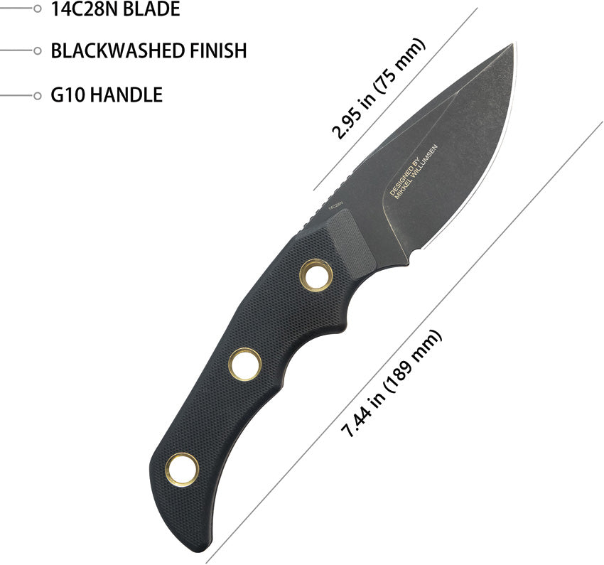 7.45" (18.92cm) overall. 3" (7.62cm) black stonewash finish 14C28N Sandvik stainless drop point blade. Black G10 handle. Full tang. Lanyard hole. Black Kydex belt sheath. Boxed.