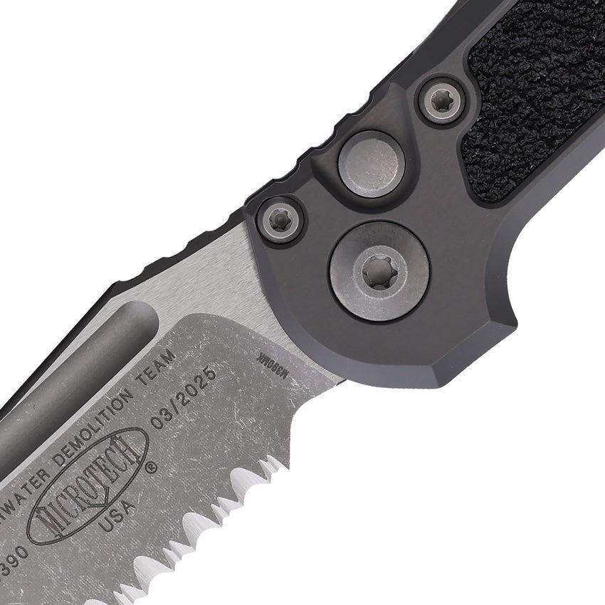 Automatic opening. 4.5" (11.43cm) closed. 3.5" (8.89cm) Apocalyptic finish partially serrated Bohler M390MK stainless tanto blade. Gray aluminum handle with black traction insert. Lanyard hole. Pocket clip. Boxed.