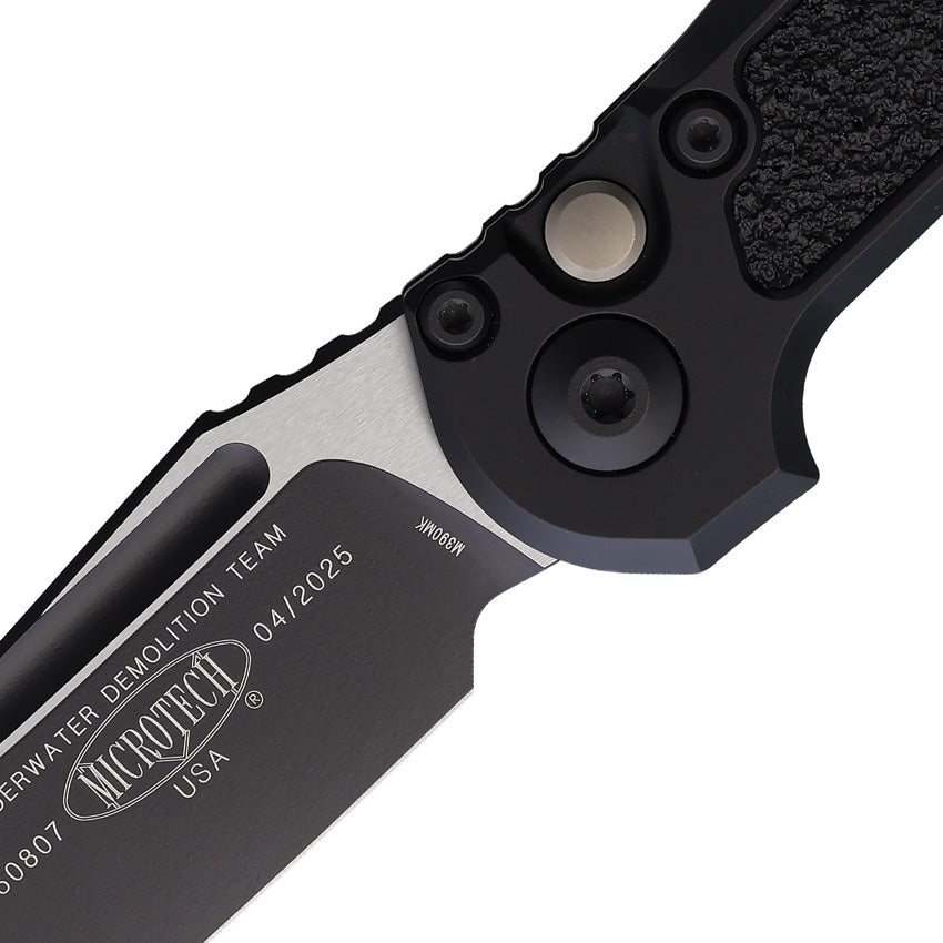 Automatic opening. 4.5" (11.43cm) closed. 3.5" (8.89cm) two-tone finish Bohler M390MK stainless tanto blade. Black aluminum handle with black traction insert. Lanyard hole. Pocket clip. Boxed.