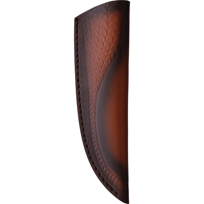 9.75" (24.77cm) overall. 5.75" (14.61cm) Damascus steel skinner blade. Brass guard and pommel. Stag bone and red pakkawood handle. Brown leather belt sheath. Boxed.