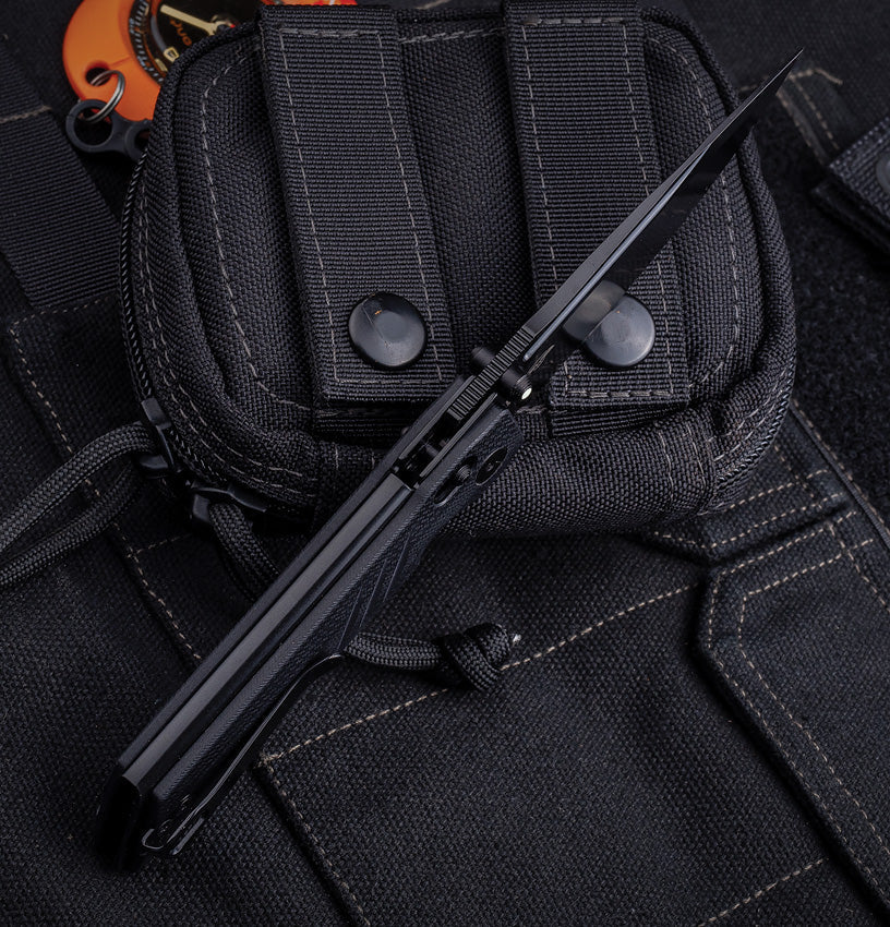 4.13" (10.49cm) closed. 3.25" (8.26cm) black PVD coated Bohler K110 stainless blade. Black G10 handle. Pocket clip. Thumb stud. Boxed.