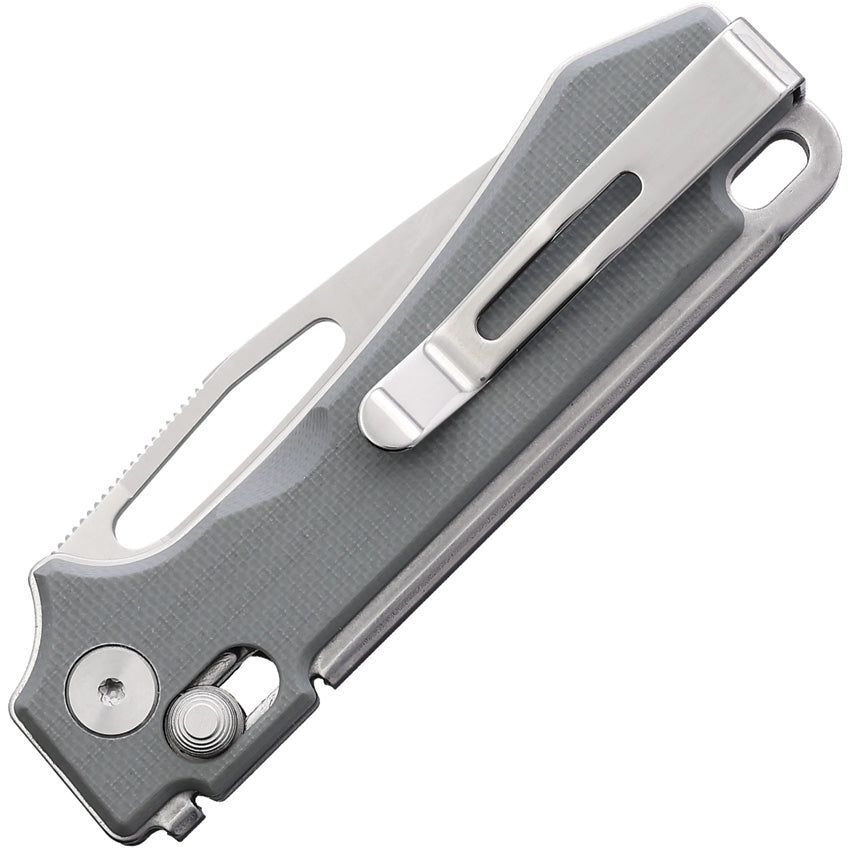 3.5" (8.89cm) closed. 2.75" (6.99cm) satin finish 12C27 Sandvik stainless blade. Gray G10 handle. Thumb pull. Lanyard hole. Pocket clip. Boxed.