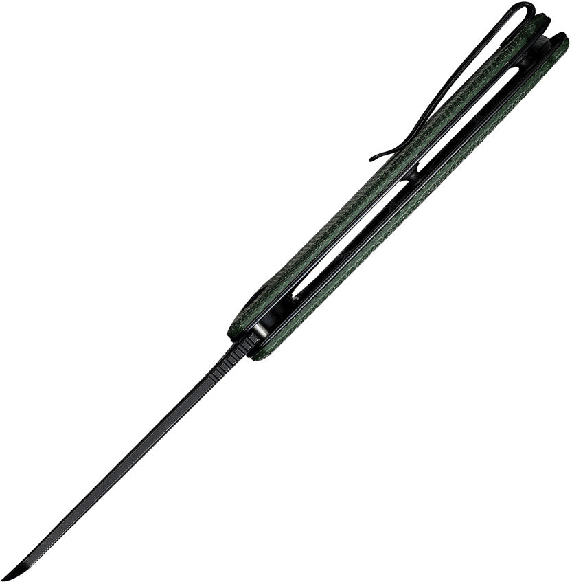 4.63" (11.76cm) closed. 3.5" (8.89cm) black stonewash finish 9Cr18MoV stainless sheepsfoot blade. Green canvas micarta handle. Extended tang. Lanyard hole. Pocket clip. Black nylon zippered storage case. Boxed.