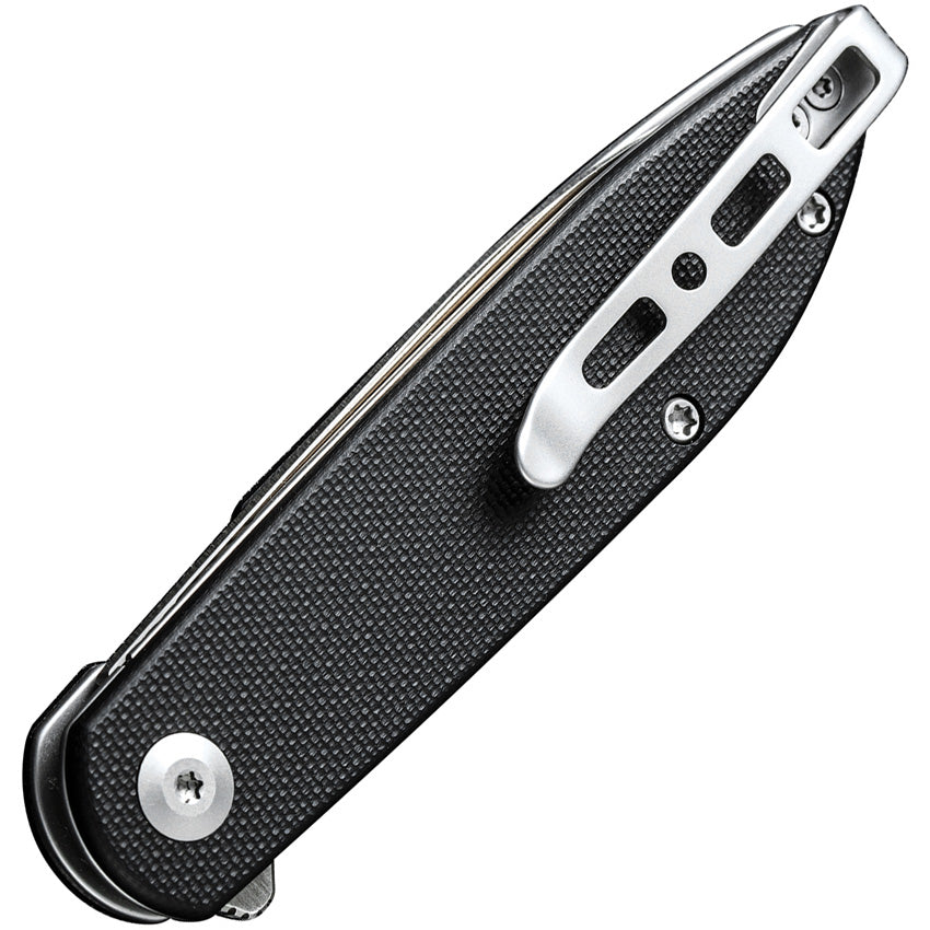 3.75" (9.53cm) closed. 3" (7.62cm) satin finish D2 tool steel drop point blade. Black G10 handle. Extended tang. Pocket clip. Black nylon zippered storage case.