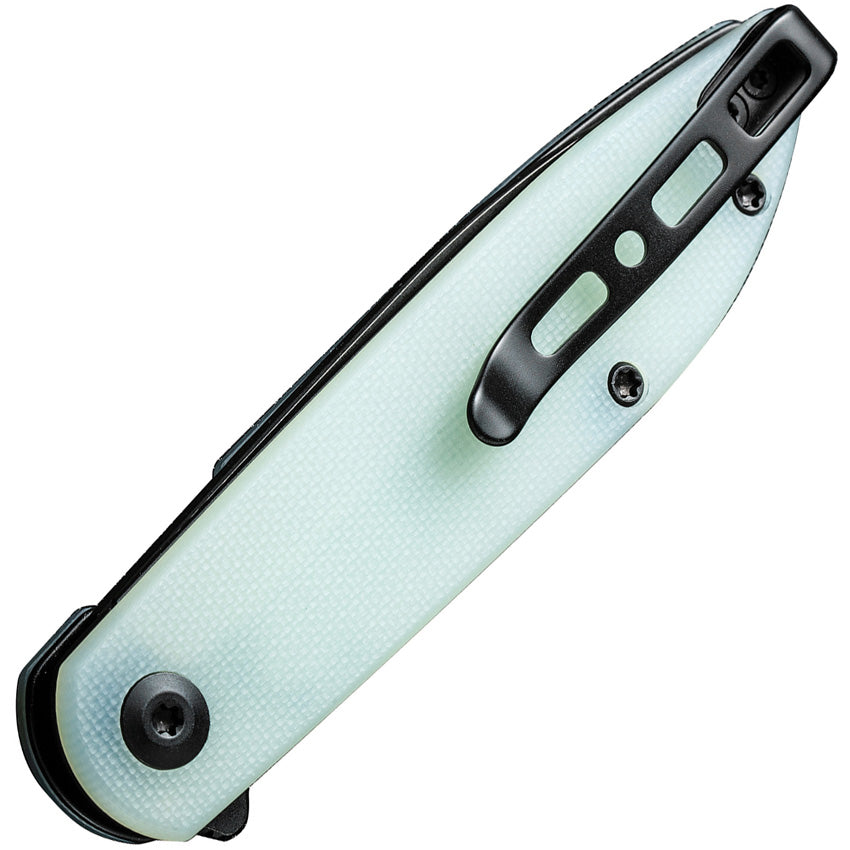 3.75" (9.53cm) closed. 3" (7.62cm) black stonewash finish D2 tool steel drop point blade. Jade G10 handle. Extended tang. Pocket clip. Black nylon zippered storage case.
