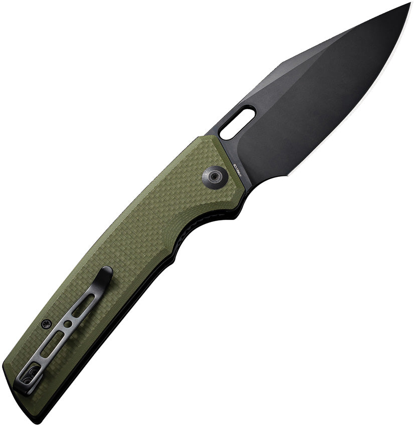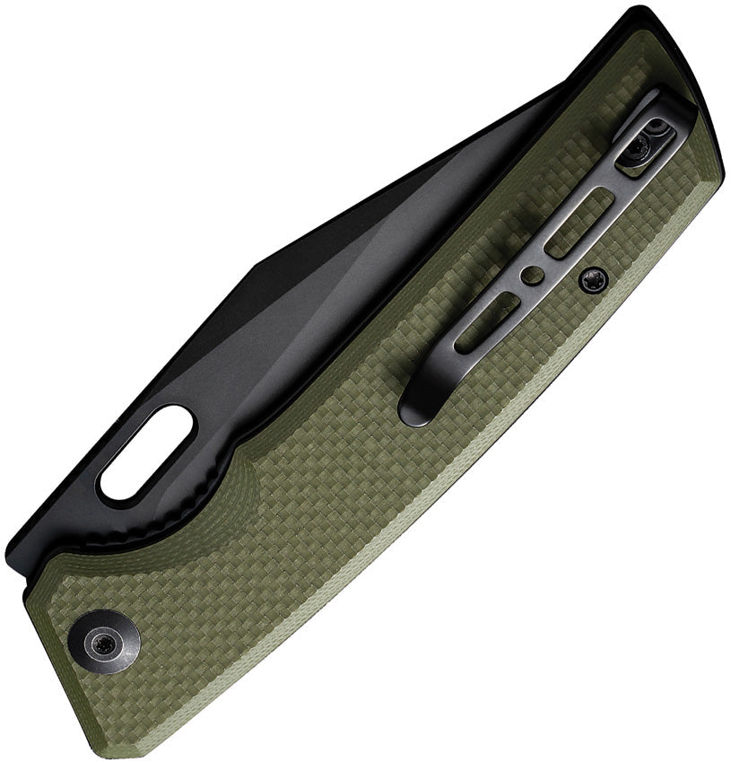 4.75" (12.07cm) closed. 3.75" (9.53cm) black stonewash finish 9Cr18MoV stainless blade. OD green G10 handle. Thumb pull. Pocket clip. Black nylon zippered storage case. Boxed.