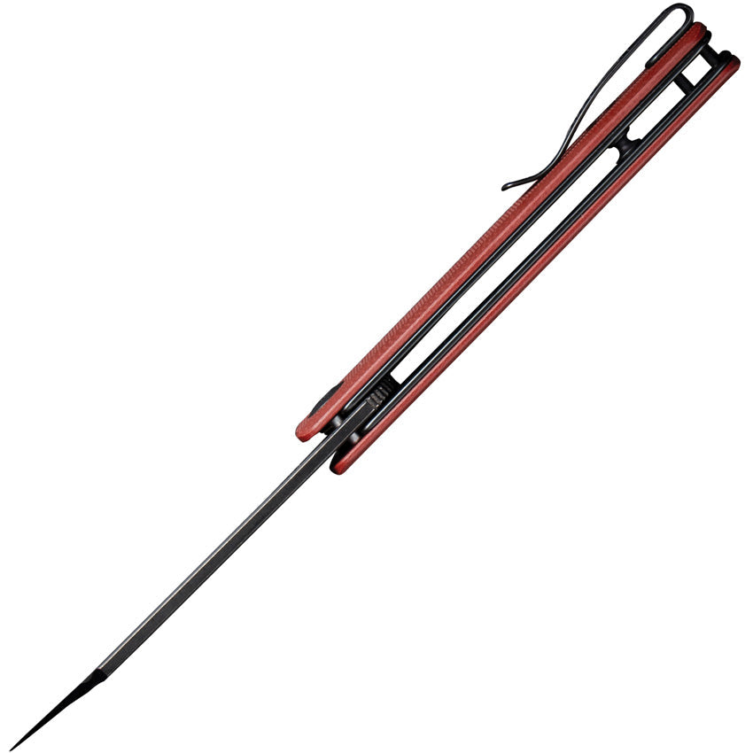 4.5" (11.43cm) closed. 3.38" (8.59cm) black stonewash finish 9Cr18MoV stainless blade. Burgundy G10 handle. Extended tang. Pocket clip. Black nylon zippered storage case. Boxed.