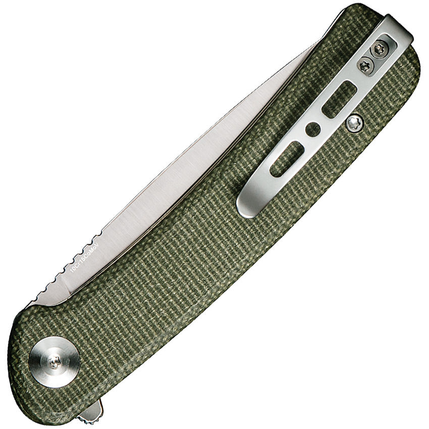 4.25" (10.8cm) closed. 3.25" (8.26cm) satin finish 10Cr15CoMoV stainless drop point blade. Green micarta handle. Extended tang. Pocket clip. Black nylon zippered storage case. Boxed.