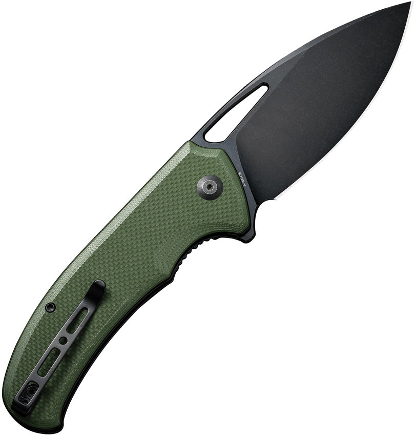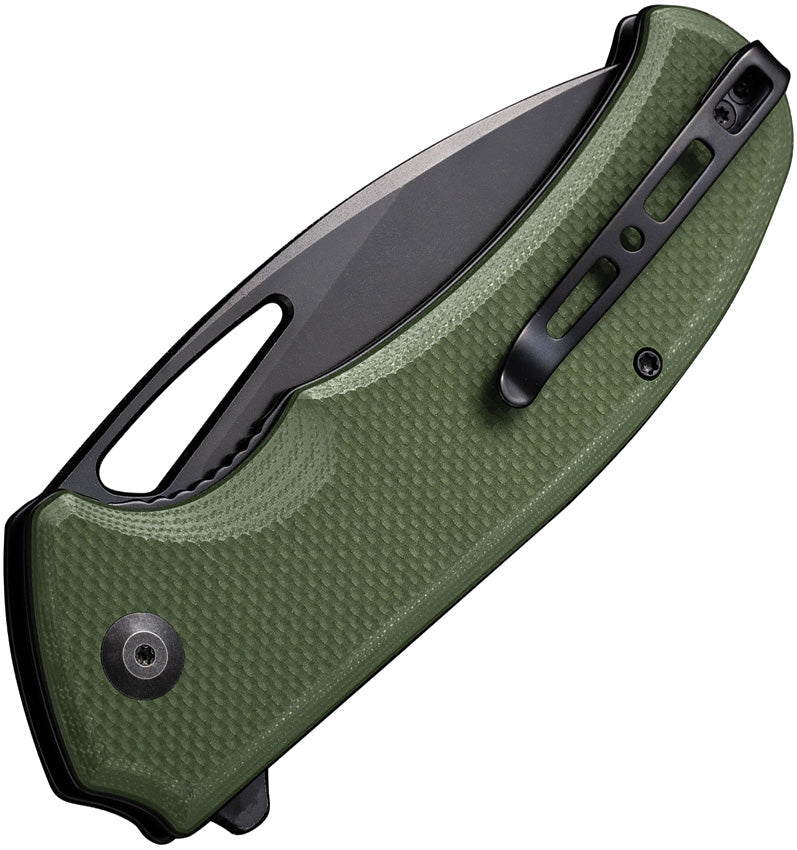 5" (12.7cm) closed. 3.75" (9.53cm) black stonewash finish 9Cr18MoV stainless drop point blade. OD green G10 handle. Extended tang. Thumb pull. Pocket clip. Black nylon zippered storage case. Boxed.