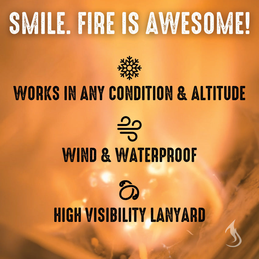 3" overall. 3500+ strikes. 5000 degree spark shower. Works in any condition and altitude. Wind and waterproof. High visibility paracord lanyard. Stainless striker. Hang packaged.