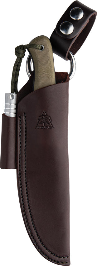 9.75" (24.77cm) overall. 4.75" (12.07cm) black Tungsten Cerakote 1095HC steel blade. Green canvas micarta handle. Sheath includes ferro rod. Brown leather belt sheath. Bulk packed.