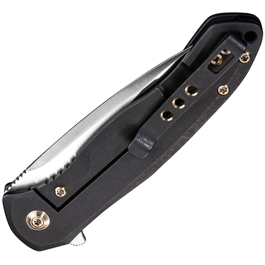 4,25" (10,8 cm) cerrada. Hoja de acero inoxidable CPM S35VN de 3,25" (8,26 cm) con acabado satinado. Mango de titanio con acabado stonewash negro. Espiga extendida. Orificio para cordón. Clip de bolsillo. Estuche de almacenamiento con cremallera de nailon negro. En caja.
