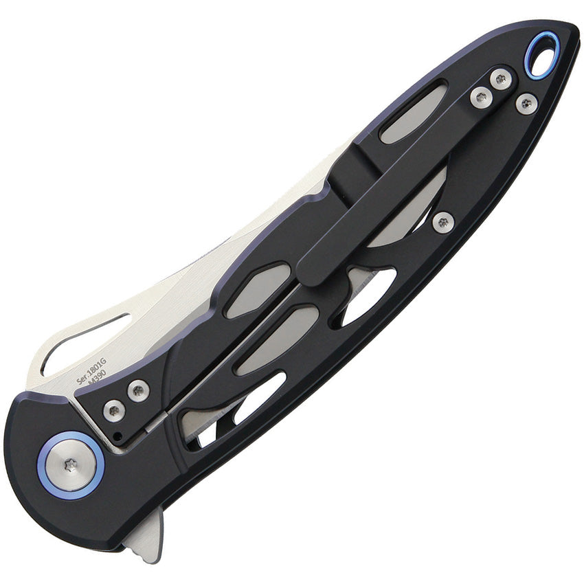 5" closed. 3.75" satin finish Bohler M390 stainless blade. Black titanium handle. Extended tang. Thumb pull. Pocket clip. Lanyard hole. Black nylon zippered storage case. Boxed.