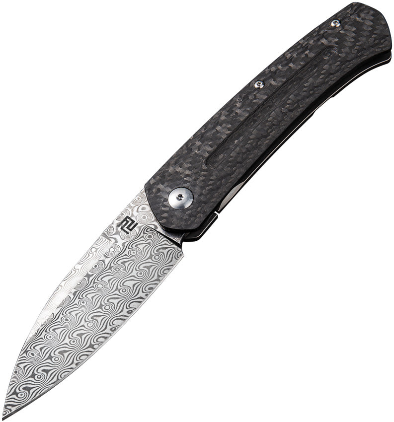 4.5" (11.43cm) closed. 3.5" (8.89cm) Damascus steel blade. Carbon fiber handle with titanium back handle. Extended tang. Pocket clip. Boxed.