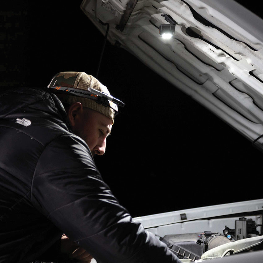 Dimensions: 2.9" x 2.2" x 1.7". Strobe. Water resistant. Impact resistant. Rechargeable. White and red LEDs. Modes: Boost/All-On (800 lumens, 4h runtime); High (600 lumens, 8h runtime); Low (300 lumens, 10h runtime); Red (2.5 lumens, 56h runtime). Adjustable woven fabric head strap with silicone grip. USB-C charging cable. Light can be removed from bracket for charging. Magnet allows for use as a hands-free area light while the slim profile also pivots allowing up to a 64 degree lighting angle Requires (1) Lithium battery (included). Clam packed.