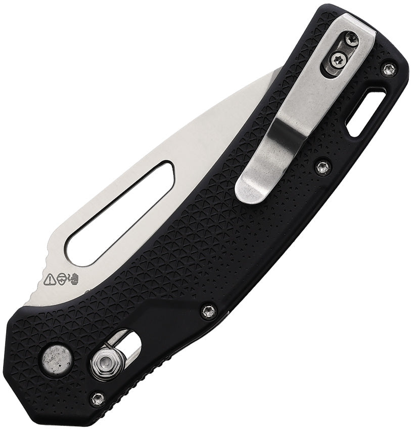 4" (10.16cm) closed. 3" (7.62cm) satin finish D2 tool steel drop point blade. Black nylon handle. Thumb pull. Lanyard hole. Pocket clip. Boxed.
