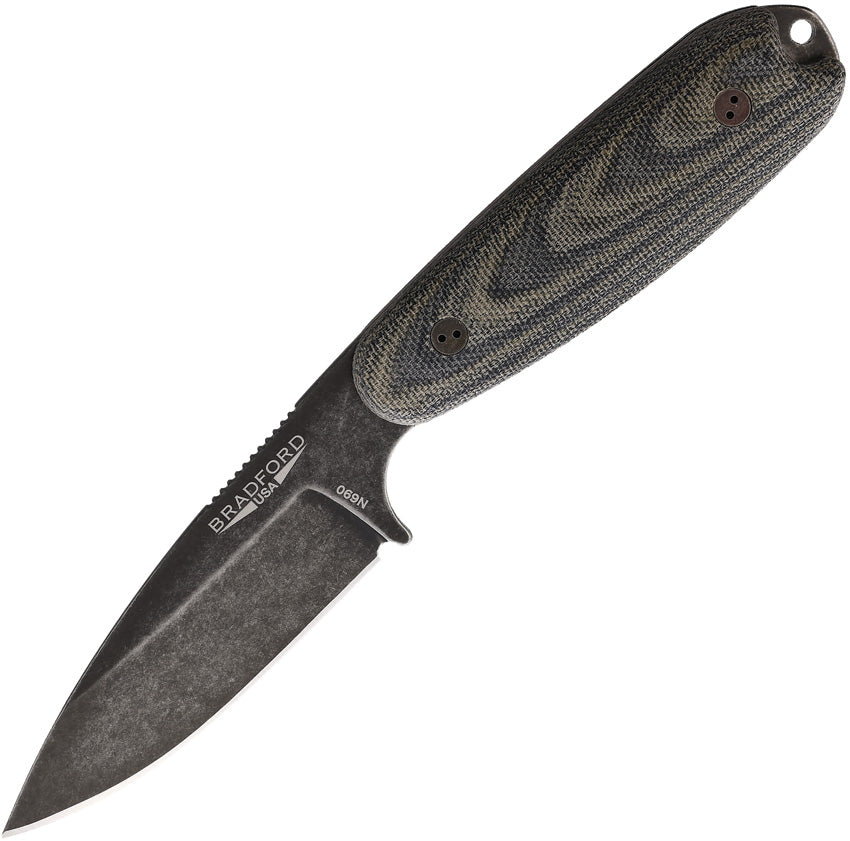 7.63" (19.38cm) overall. 3.75" (9.53cm) Nimbus finish Bohler N690 stainless blade. Black canvas micarta handle. Full, extended tang. Lanyard hole. Sabre grind blade. Brown leather belt sheath. Boxed.