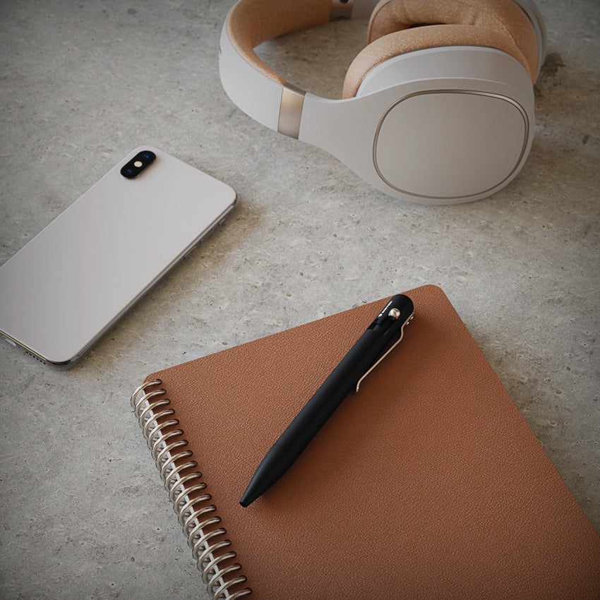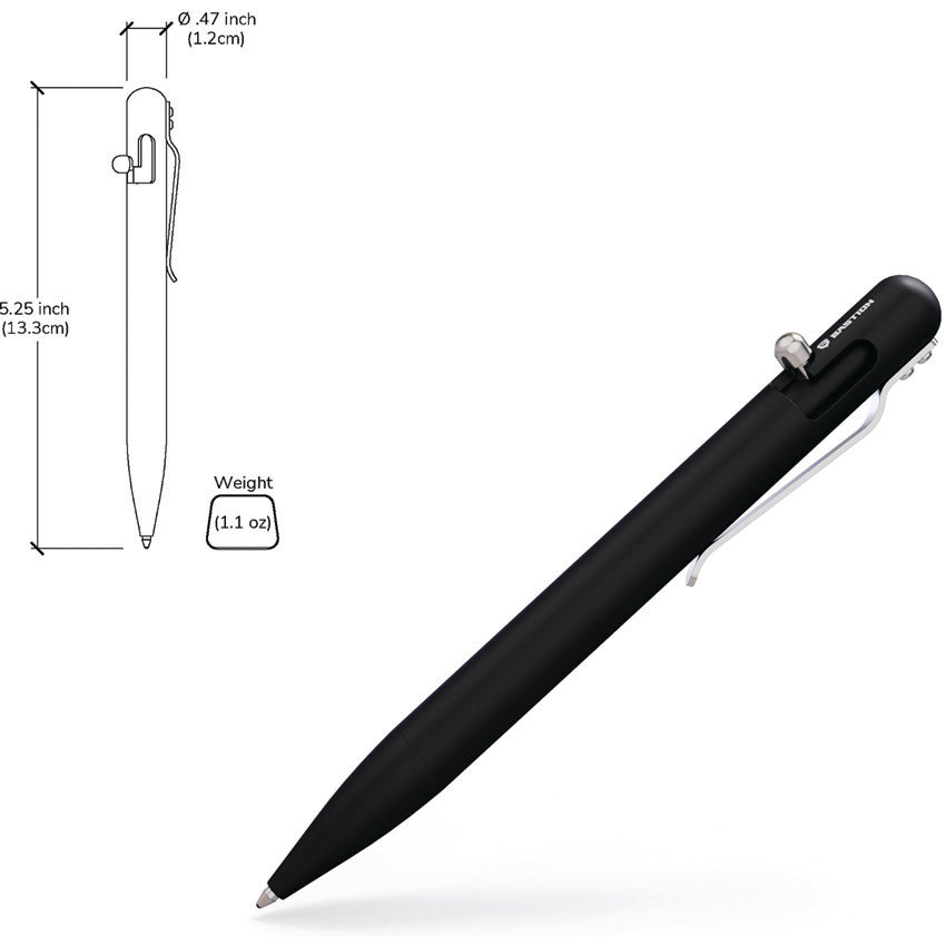 5.25" overall. Pocket clip. Black 6061-T6 grade aluminum construction. Bolt action operation. Uses Parker style ink cartridges. Boxed.