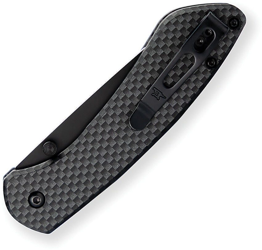 4.25" (10.8cm) closed. 3.25" (8.26cm) black finish stainless blade. Carbon fiber handle. Thumb stud. Pocket clip. Boxed.