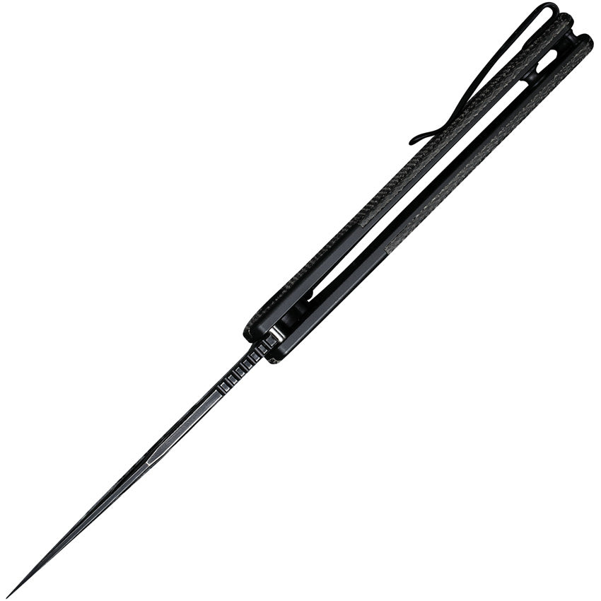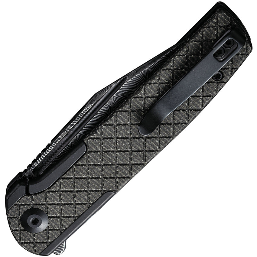 4.5" (11.43cm) closed. 3.5" (8.89cm) Damascus steel clip point blade. Black stainless handle with Dark green micarta inlay. Extended tang. Pocket clip. Black hand rubbed blade. Black nylon zippered storage case. Boxed.