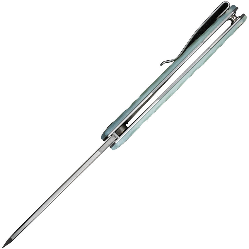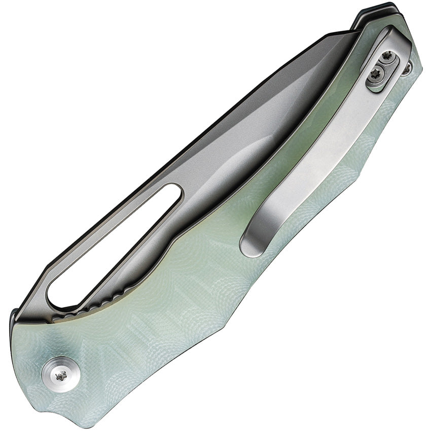 4.25" (10.8cm) closed. 3.5" (8.89cm) stonewash finish 14C28N Sandvik stainless blade. Jade sculpted G10 handle. Thumb pull. Pocket clip. Black nylon zippered storage case.