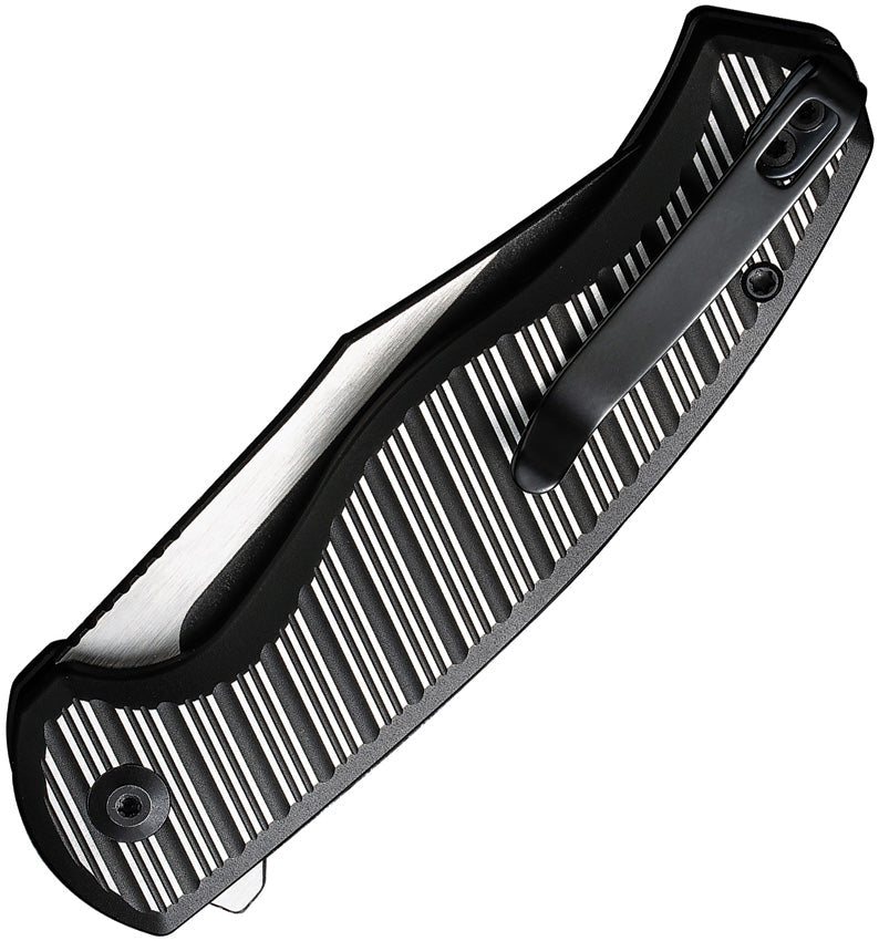 4.25" (10.8cm) closed. 3.25" (8.26cm) black stonewash and satin finish Nitro V steel clip point blade. Black and silver aluminum handle. Extended tang. Pocket clip. Black nylon zippered storage case. Boxed.