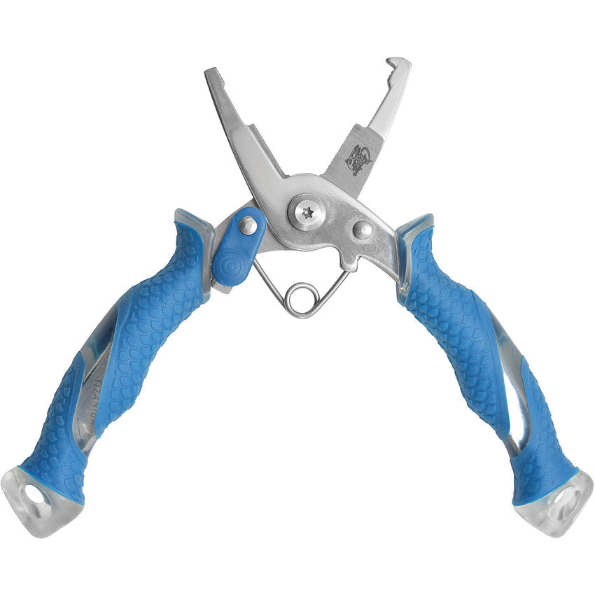 5.38" overall. Tools include: Lanyard loop. Integrated ring splitter and crimper. Cuts braid. Full tang. Stainless construction. Locks for safety. Clear rubberized handle with blue Cuda scale pattern non-slip grip. Clam packed.