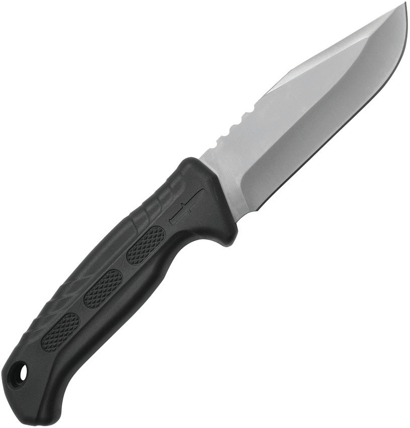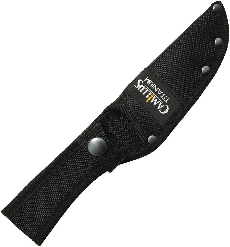 9" (22.86cm) overall. 4" (10.16cm) titanium coated 420 stainless blade. Black TPR handle. Full tang. Lanyard hole. Black nylon belt sheath. Clam packed.
