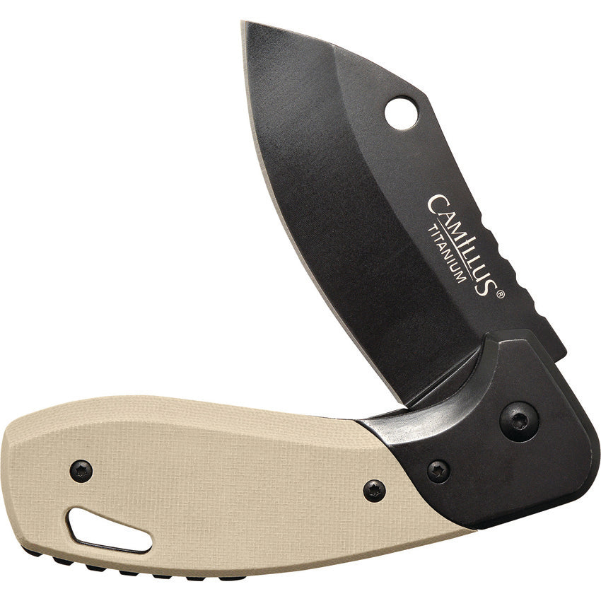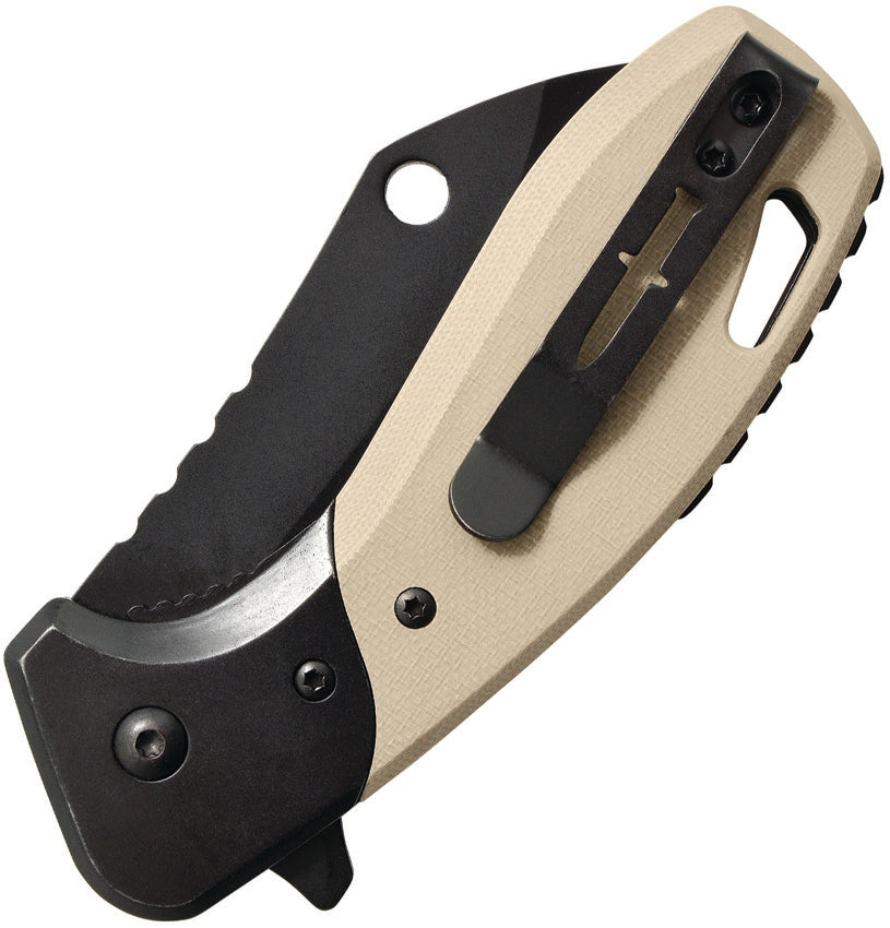 Assisted opening. 4" (10.16cm) closed. 2.75" (6.99cm) black titanium coated 440 stainless blade. Tan G10 handle. Extended tang. Pocket clip. Lanyard hole. Clam packed.