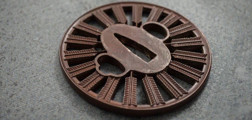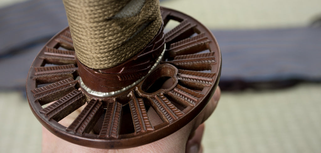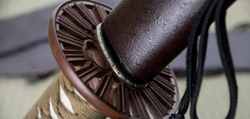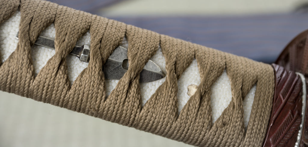 42.25" overall. 28.38" satin finish tool steel blade. White rayskin handle. Hamon curves beautifully from kissaki to kashira. Black sageo and buffalo horn kurikata and kojiri. Golden cord wrapped handle. Silver arrowhead menuki, seppa and habaki. Round tsuba with detailed arrow fletching spokes. Dark brown wooden scabbard. Boxed.
