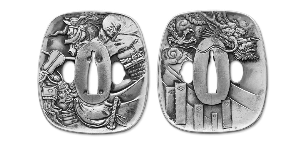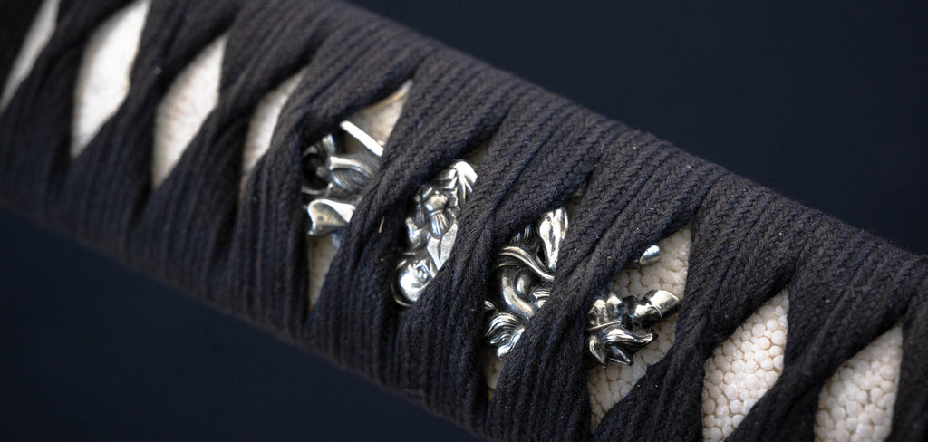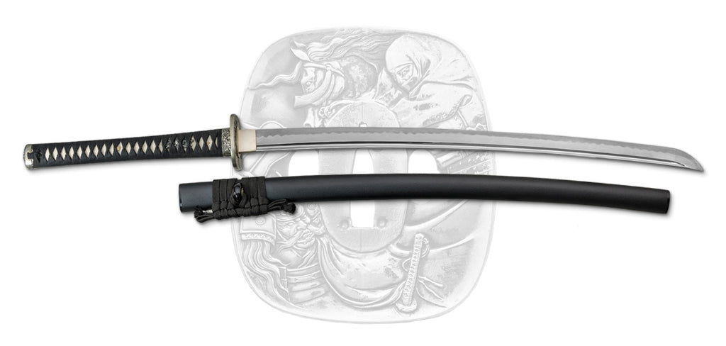 42.5" (107.95cm) overall. 28" (71.12cm) blade. Weight: 2.9lb. T10 and 9260 steel blade with a deep hi and dark hamon. Black silk wrapped handle. Tsuba depicts Uesugi Kenshin and Takeda Shingen engaged in combat. Black wood scabbard. Boxed.