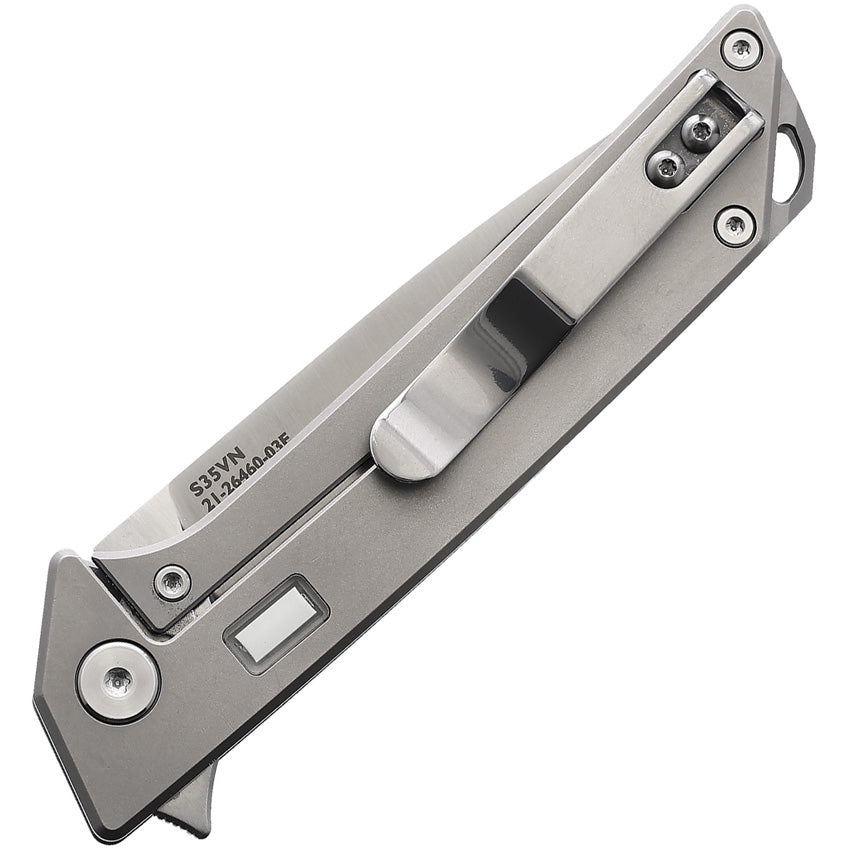 4.13" (10.49cm) closed. 3" (7.62cm) satin finish S35VN stainless blade. Gray titanium handle with Tritium front and back handle inserts. Extended tang. Lanyard hole. Pocket clip. Boxed.