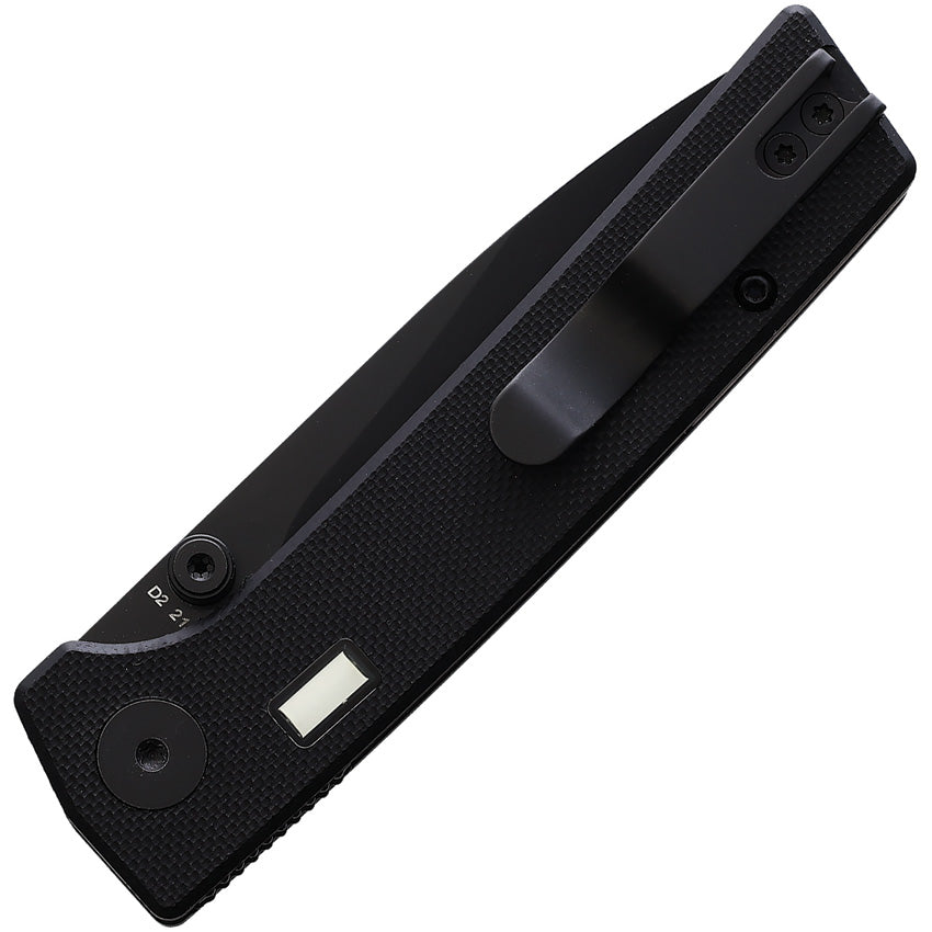 4" (10.16cm) closed. 3" (7.62cm) black PVD coated D2 tool steel blade. Black G10 handle. Pocket clip. Black thumb stud and green tritium handle inlay. Boxed.