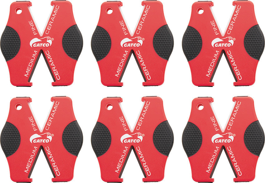 Pack of six. Dimensions: 2.75" x 2.63" x 0.38". Red ABS handle. Non-slip base. Lanyard hole. Sharpens plain and serrated edge blades. Two medium and two fine sharpening rods. Preset sharpening angle. Alumina ceramic sharpening rods. Individually clam packed. Boxed.
