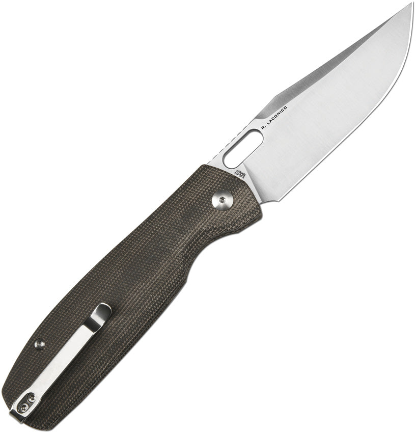 4.75" (12.07cm) closed. 3.75" (9.53cm) sand blast finish AR-SFII steel clip point blade. OD green canvas micarta handle. Thumb pull. Pocket clip. Boxed.