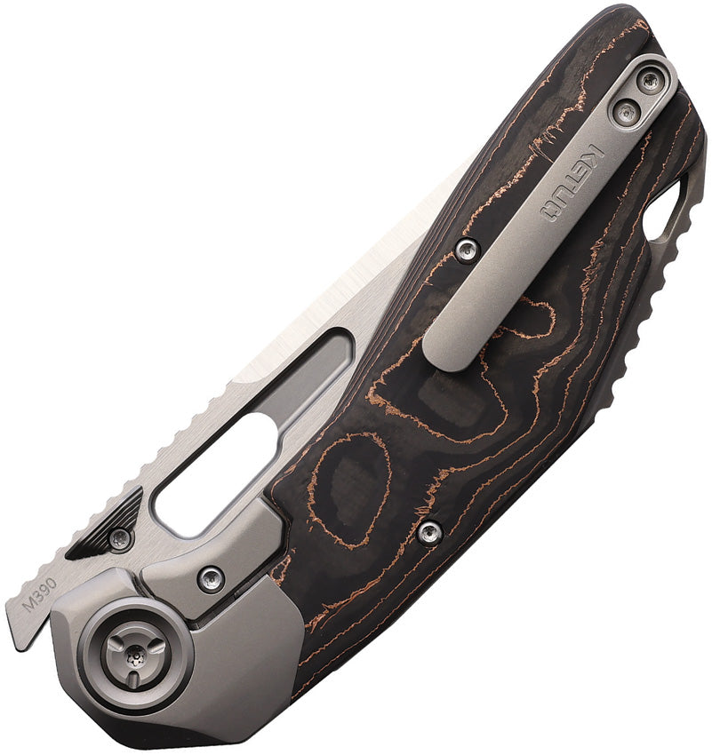4.5" (11.43cm) closed. 3.25" (8.26cm) satin finish Bohler M390 stainless tanto blade. Copper Foil carbon fiber handle. Titanium bolster(s). Thumb disk. Thumb pull. Lanyard hole. Pocket clip. Extended tang. Boxed.