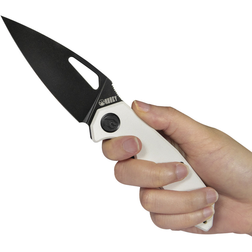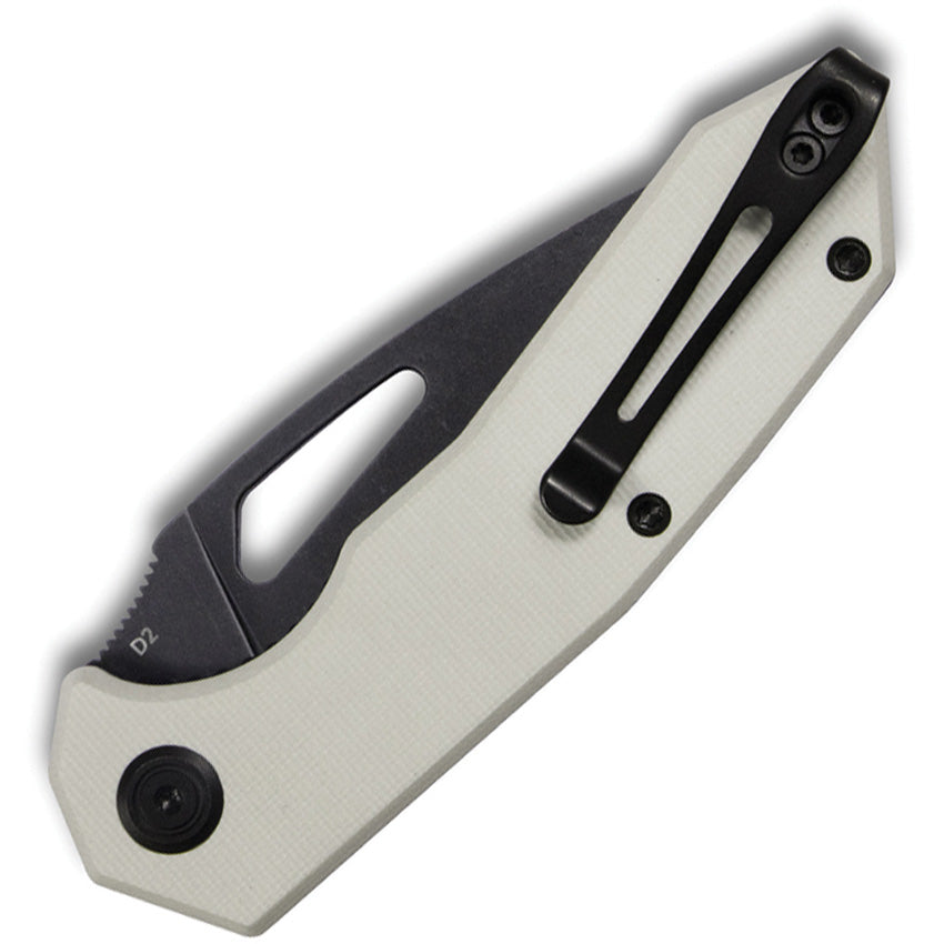 4.13" (10.49cm) closed. 3.13" (7.95cm) black stonewash finish D2 tool steel blade. Tan G10 handle. Thumb pull. Pocket clip. Boxed.