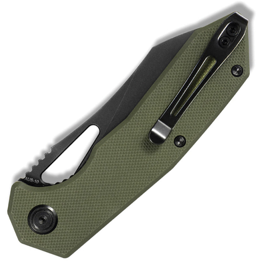 4.13" (10.49cm) closed. 3" (7.62cm) black stonewash finish AUS-10A stainless blade. OD green G10 handle. Extended tang. Thumb pull. Pocket clip. Boxed.