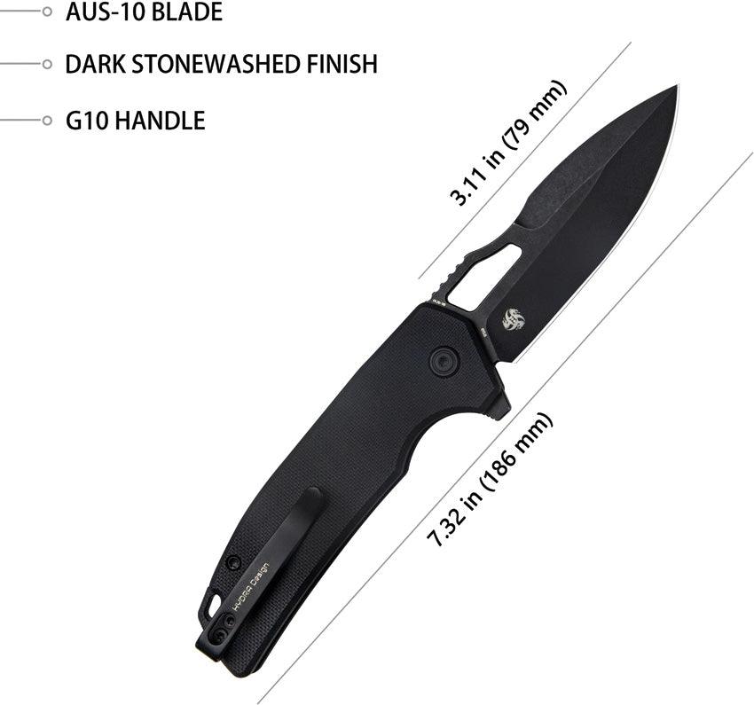 4.25" (10.8cm) closed. 3.13" (7.95cm) black stonewash finish AUS-10A stainless blade. Black G10 handle. Thumb pull. Extended tang. Lanyard hole. Pocket clip. Boxed.