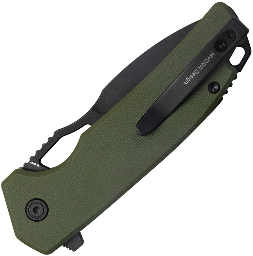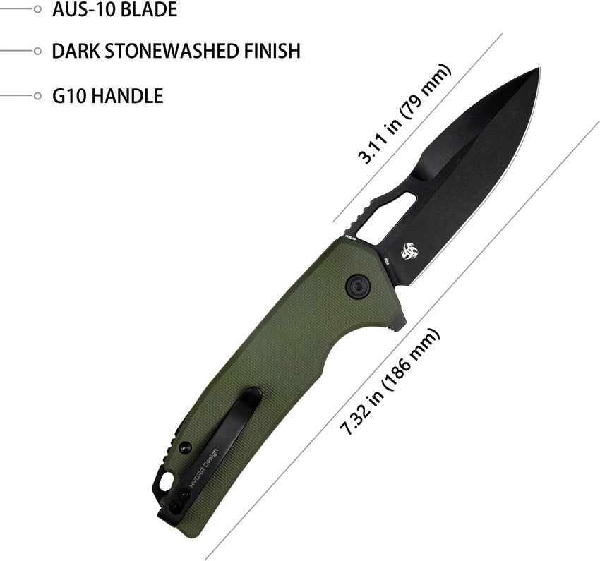 4.25" (10.8cm) closed. 3.13" (7.95cm) black stonewash finish AUS-10A stainless blade. OD green G10 handle. Thumb pull. Extended tang. Lanyard hole. Pocket clip. Boxed.