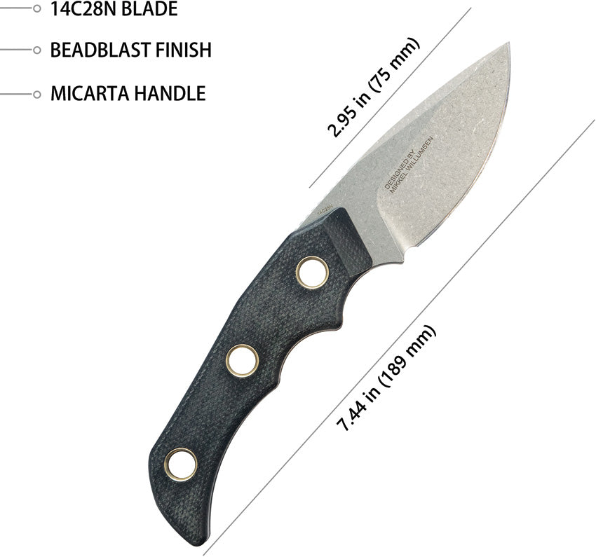 7.45" (18.92cm) overall. 3" (7.62cm) stonewash finish 14C28N Sandvik stainless drop point blade. Black canvas micarta handle. Full tang. Lanyard hole. Black Kydex belt sheath. Boxed.