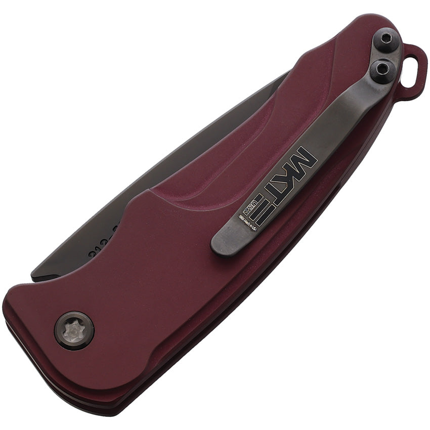 Automatic opening. 4" (10.16cm) closed. 3" (7.62cm) black PVD coated S35VN stainless drop point blade. Red anodized aluminum handle. Lanyard hole. Pocket clip. Black nylon zippered storage case.