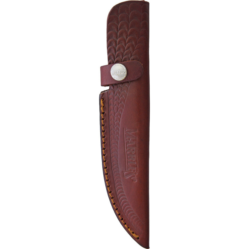 8.75" overall. 4.25" satin finish stainless clip point blade. Stag bone handle. Stainless guard. Brown leather belt sheath. Boxed.