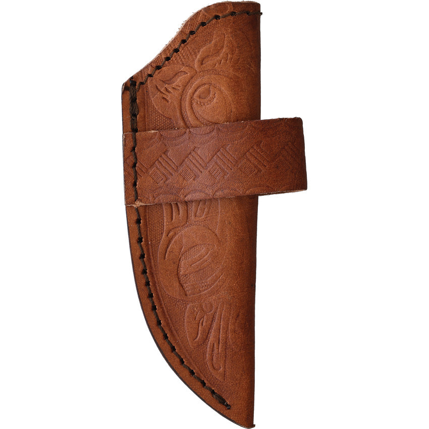 7.5" (19.05cm) overall. 3.5" (8.89cm) satin finish stainless skinner blade. Brass guard and pommel. Stacked leather, stag bone, and wood handle. Brown leather belt sheath. Boxed.